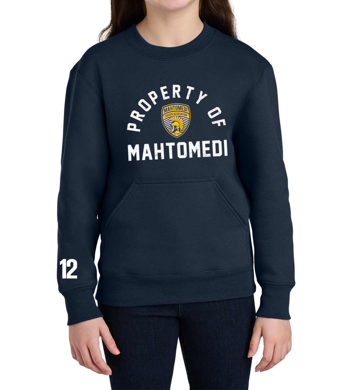 The youth version of this popular cozy crew with a hoodie-style front pocket.