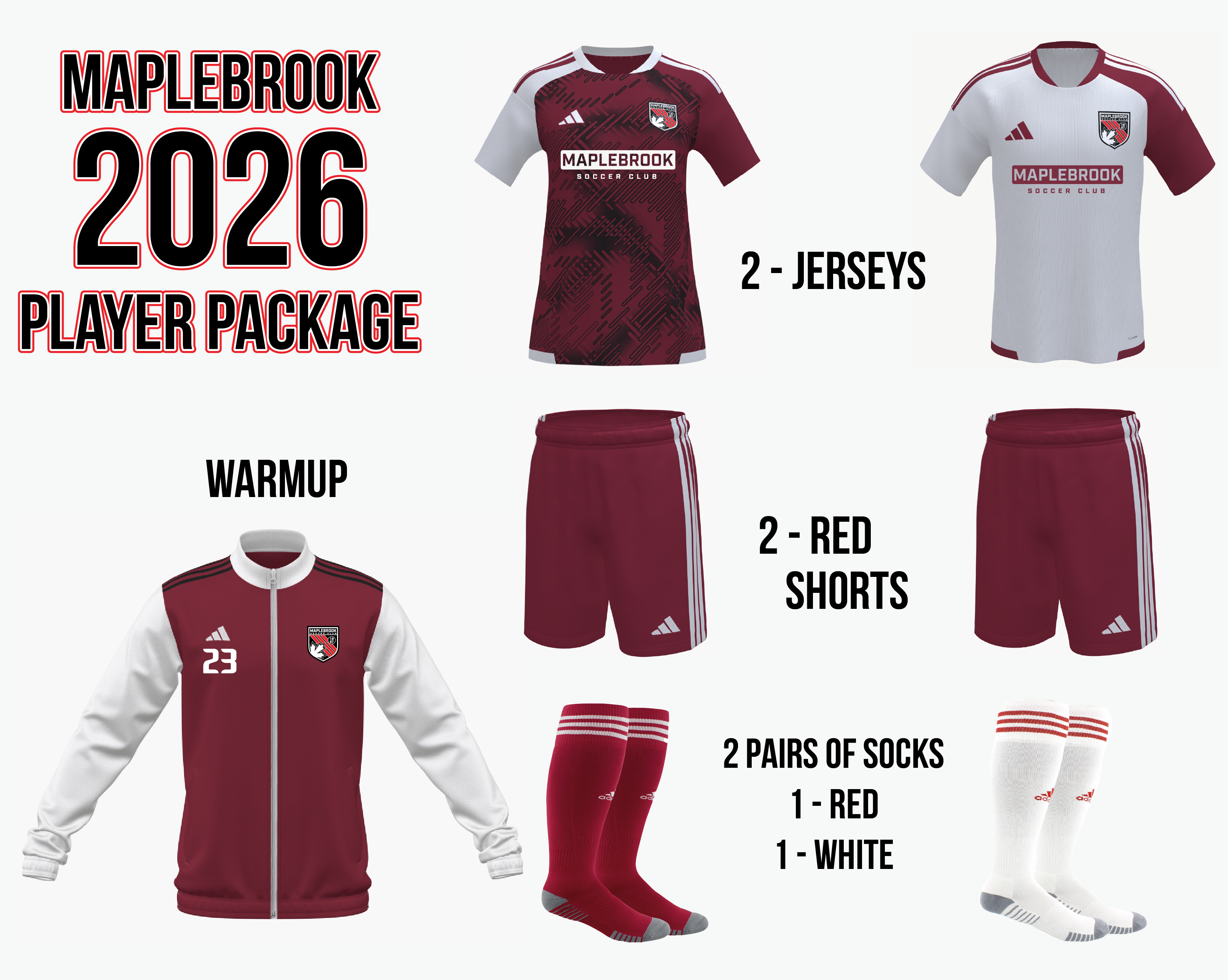 Includes 2 jerseys, 2 shorts, 2 socks, and a full zip warmup top.
